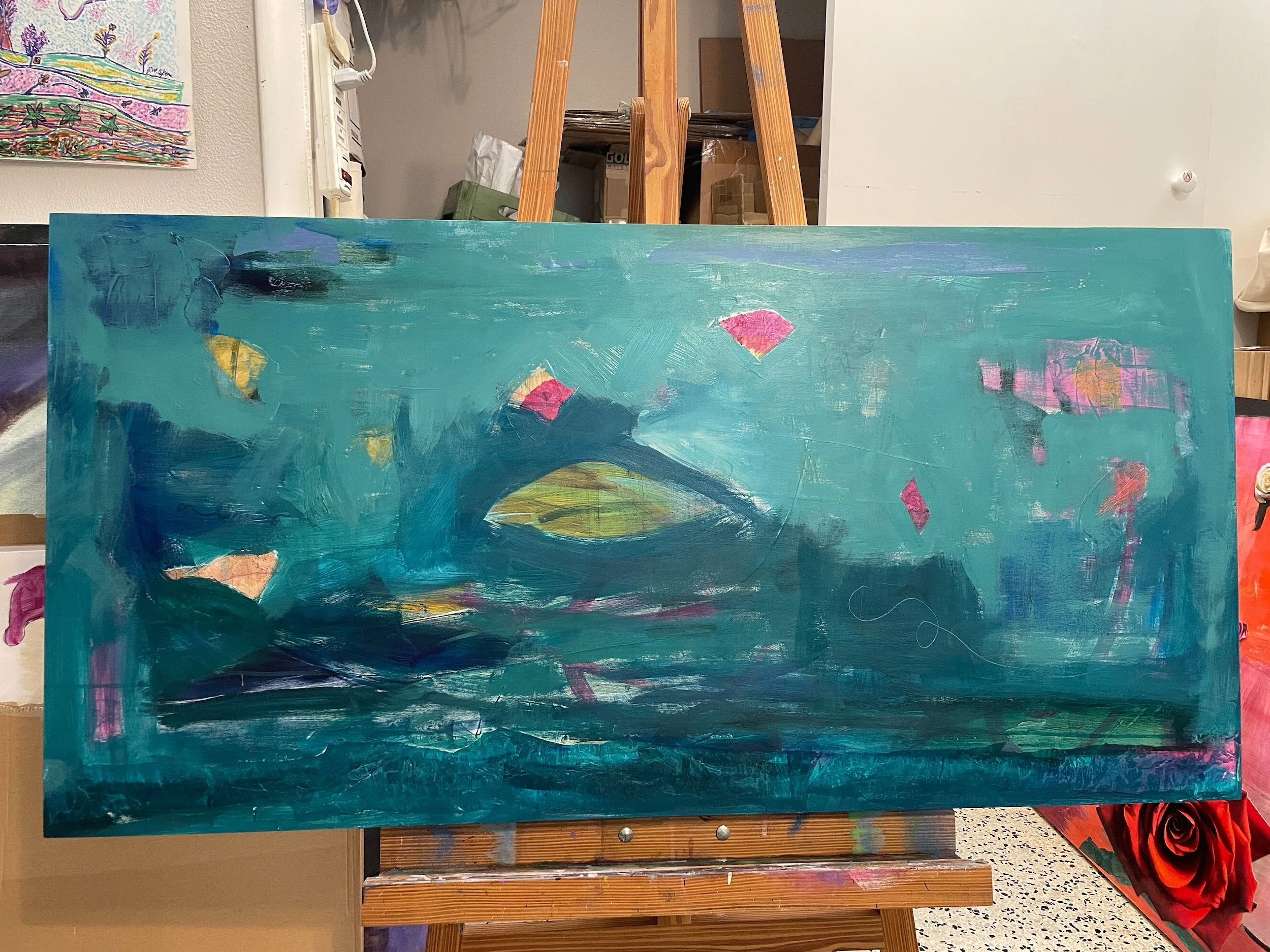 Early stages of Mums in Orbit (2025), acrylic and hand-dyed tissue paper on 24'“ x 48” wood panel.